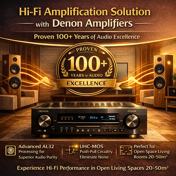 Không gian 30m2 - 50m2 (Phòng khách nhà phố, biệt thự mở): Cần dòng điện có cường độ cao và công suất thực từ 100W - 140W/kênh (Ví dụ: Denon PMA-1700NE, PMA-2500NE). Lúc này, sức mạnh của mạch Advanced UHC-MOS thực sự bùng nổ, dễ dàng lấp đầy không gian mở bằng áp suất âm thanh mạnh mẽ mà vẫn kiểm soát cực tốt độ méo tiếng dư thừa.